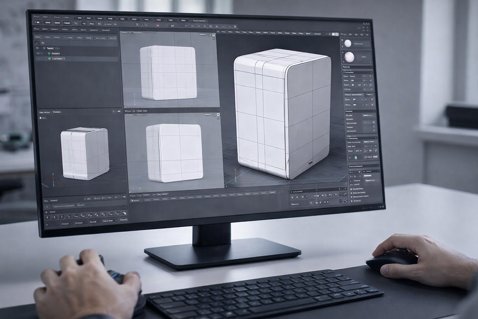 Строится базовая геометрия, затем добавляются все детали: корпус, решётки, панели, крепления и мелкие элементы. Настраиваются материалы для реалистичного внешнего вида.