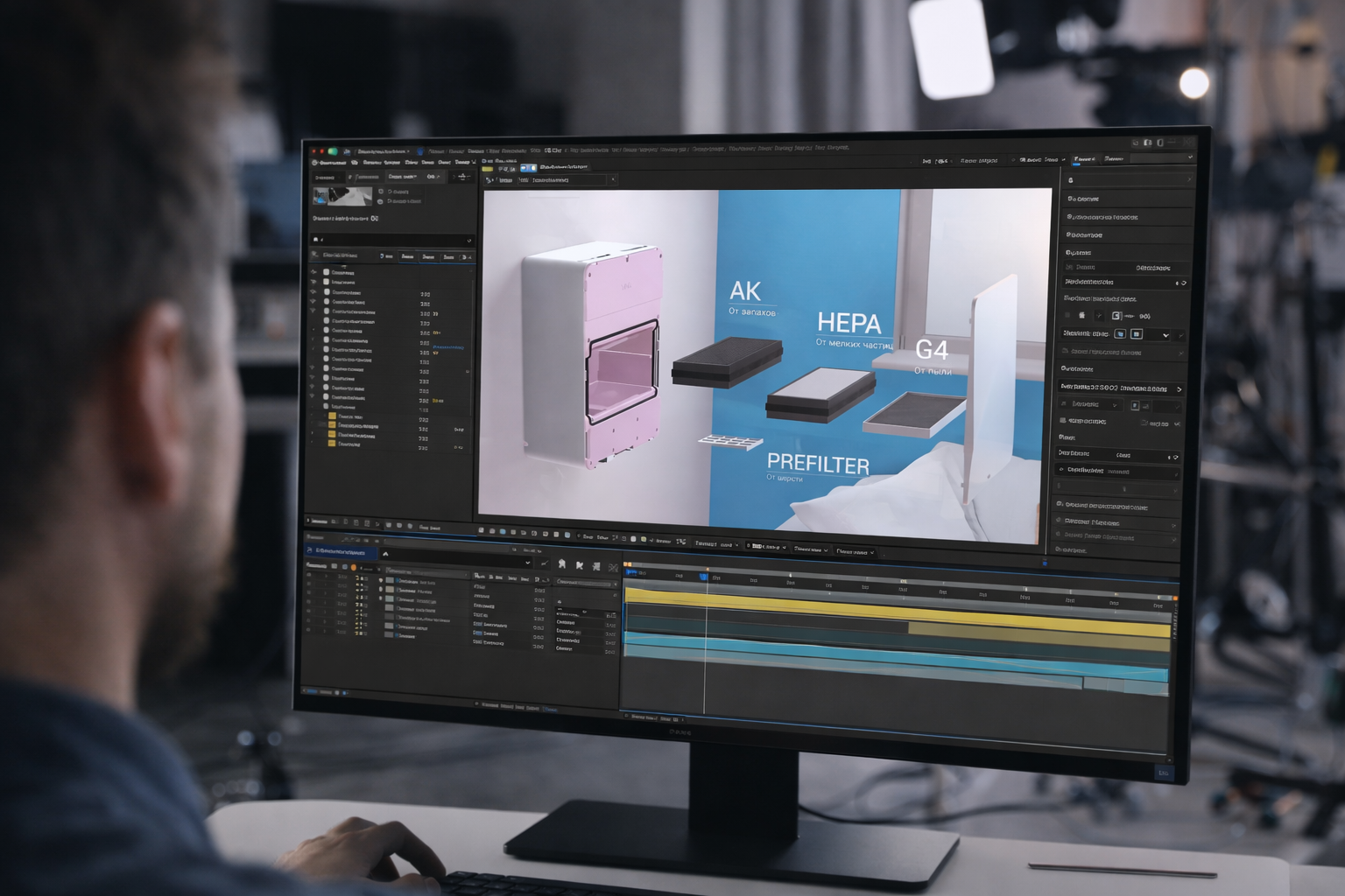 Готовится сценарий ролика, настраиваются элементы для анимации. Создаются движения (разбор, поток воздуха, пролёты камеры), настраиваются свет и окружение.