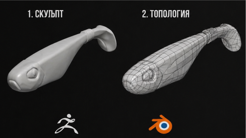 На первом этапе я сделал основную 3D-форму тела: вытянутое туловище, голову, плавный переход к хвосту и сам хвостик. Важно было, чтобы рыбка выглядела естественно и могла ассоциироваться с настоящей наживкой.