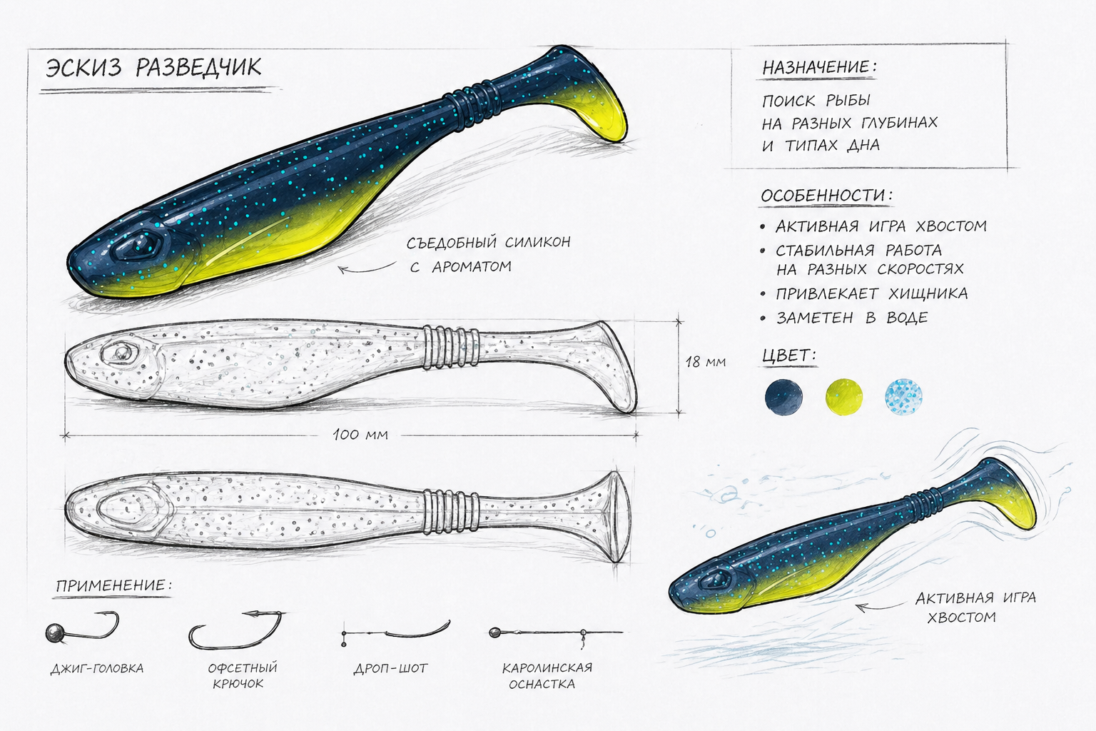 Сначала я придумал образ приманки: она должна была быть яркой, заметной и похожей на маленькую рыбку, которая активно играет в воде. Я выбрал форму мягкой силиконовой рыбки с подвижным хвостом, потому что такая форма хорошо передаёт движение.
